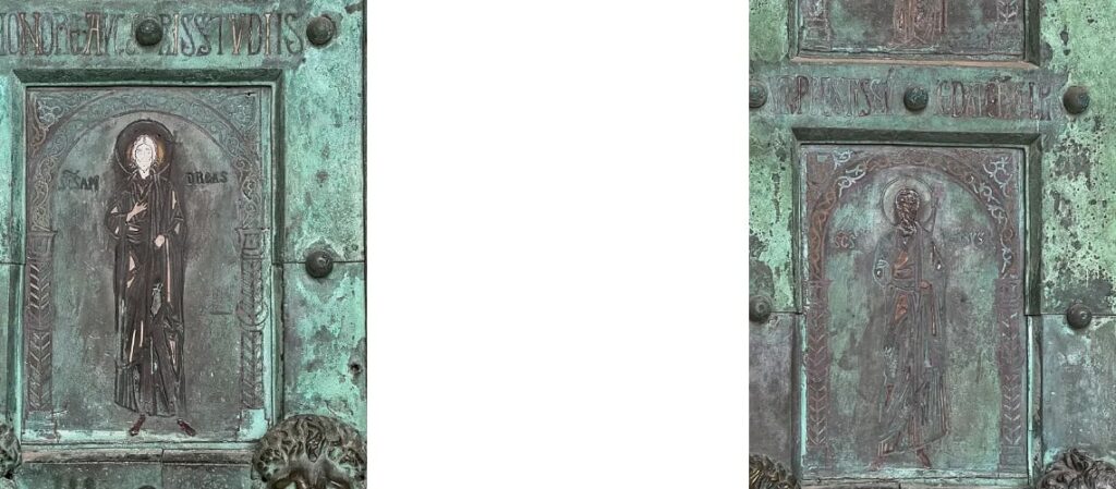 Pantaleone la donò al duomo della sua città d’origine, dedicando la porta a Sant’Andrea per il perdono dei suoi peccati e la redenzione della sua anima, come appare dalla scritta incisa sulla croce nella formella sottostante quella di Sant’ Andrea insieme alla sua discendenza familiare [Foto 2,3]. Sappiamo che sulla croce nella formella sottostante quella di San Pietro (andata persa e sostituita con una croce liscia) era incisa la scritta in latino e in greco col nome del fonditore Simeone.
