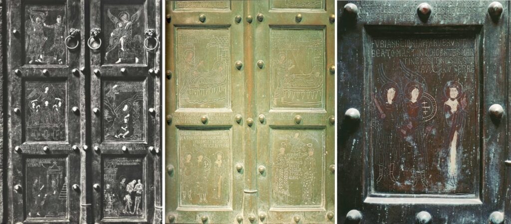 La serie delle porte bizantine eseguite a Costantinopoli (in legno rivestire da pannelli di bronzo ageminati, cornici e maniglie) dopo il dono nel 1060 della prima alla cattedrale di Amalfi, fatto dal mercante Mauro di Pantaleone amalfitano, continuò: