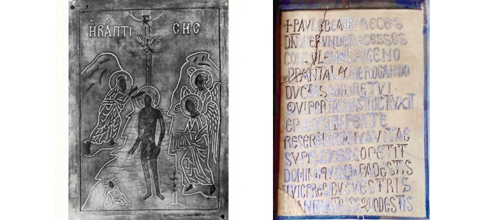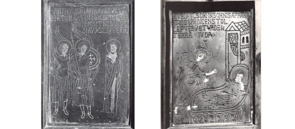 Nella porta di Atrani solo i quattro pannelli centrali hanno l’agemina bizantina; gli altri hanno una sorta di calici a bassissimo rilievo applicati, tutti uguali, da cui fuoriesce una croce, fusi probabilmente a sabbia e tenuti da quattro grosse borchie. In uno dei pannelli ageminati appare la scritta con il nome del donatore Pantaleone mentre nell’altro le iscrizioni greche ci dicono essere stata eseguita a Costantinopoli nel 1087. [Foto da 17 a 21, porta bronzea della Chiesa di San Salvatore de’ Birecto di Atrani e dettagli della stessa]