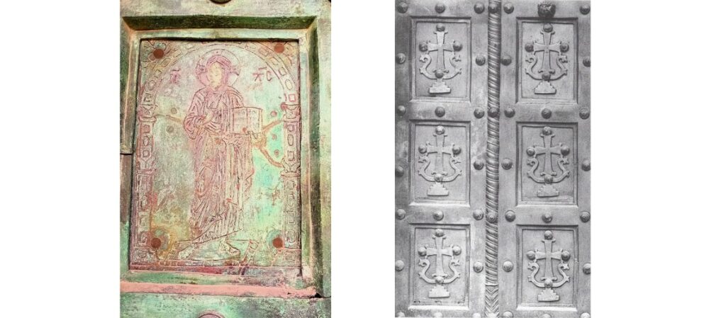 Le due porte della Cattedrale di San Marco a Venezia, quella centrale dell’ atrio e quella di San Clemente, sono state eseguite a Costantinopoli ma sono più tarde delle altre precedenti, risalendo alla prima metà del secolo XII. Sono entrambe ricoperte da formelle di bronzo con agemine tipicamente bizantine.